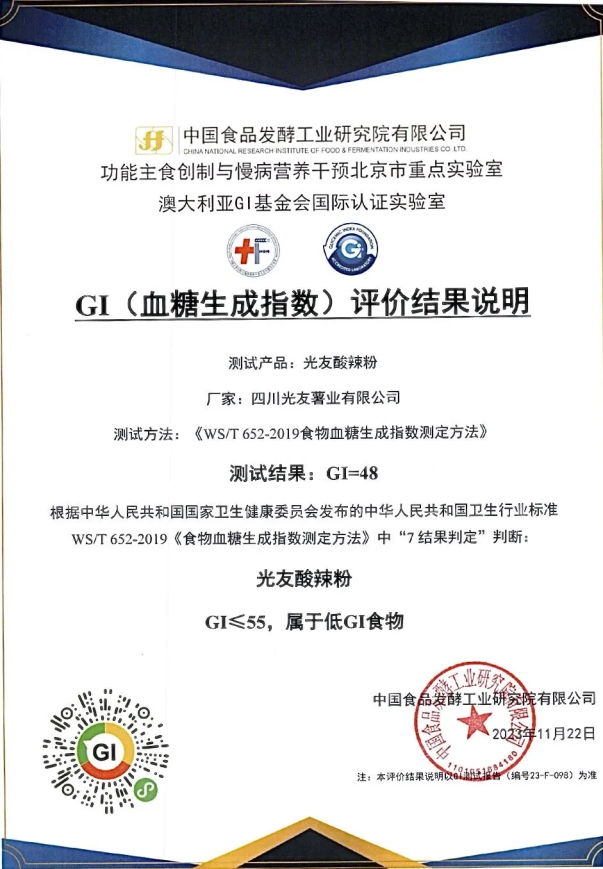 4月23日訊:近日,光友薯業(yè)收到來自中國食品發(fā)酵工業(yè)研究院GI營養(yǎng)工作室的喜訊,光友薯業(yè)生產(chǎn)的明星產(chǎn)品——光友酸辣粉成功通過中國食品發(fā)酵工業(yè)研究院GI國際聯(lián)合研究與測試實驗室標(biāo)準(zhǔn)化GI測試流程,被認(rèn)證為低GI食物。