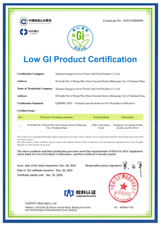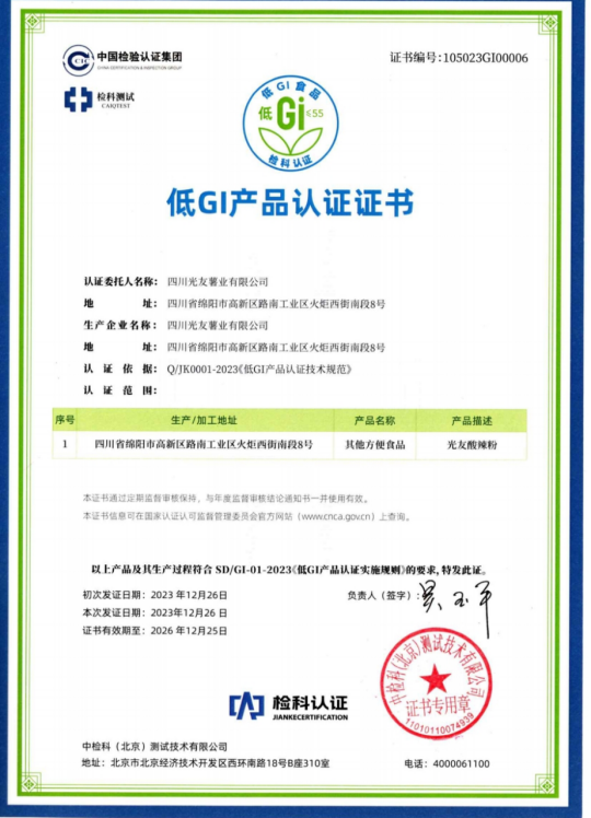 光友薯業(yè)對此次酸辣粉獲得低GI認(rèn)證表示非常榮幸和自豪,光友薯業(yè)表示,將繼續(xù)秉持“健康、美味、創(chuàng)新”的理念,不斷推出更多符合消費者需求的健康食品,為人們的健康生活貢獻(xiàn)更多力量。
