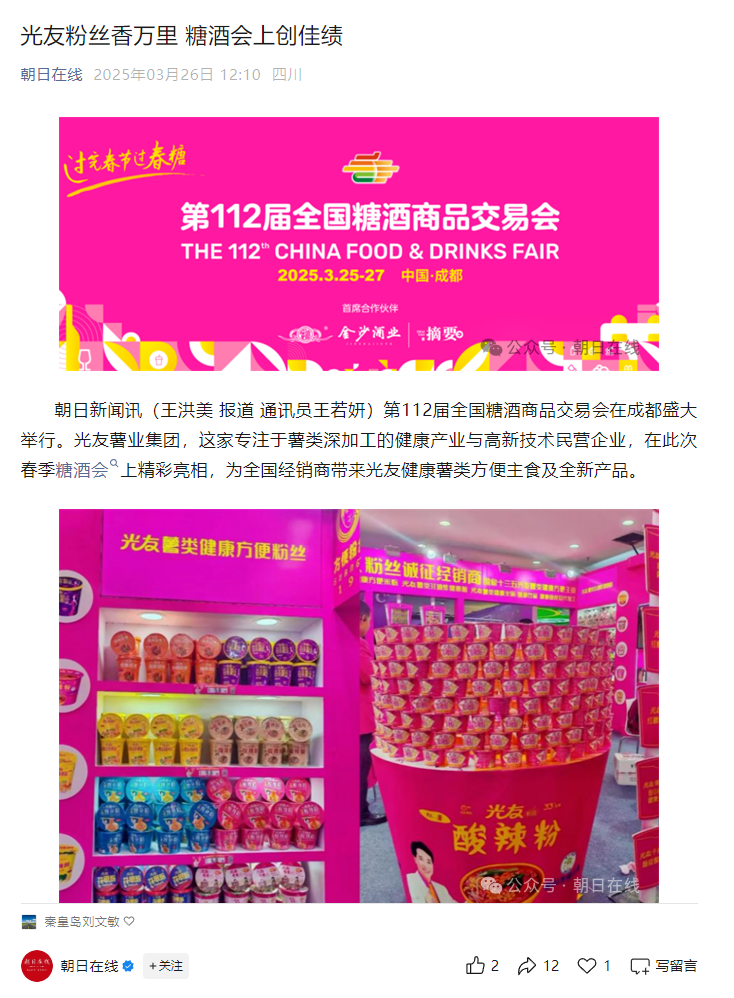 轉(zhuǎn)載朝日在線——光友粉絲香萬里 糖酒會上創(chuàng)佳績