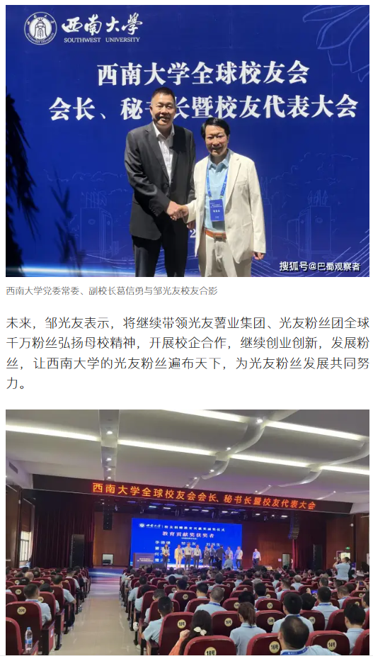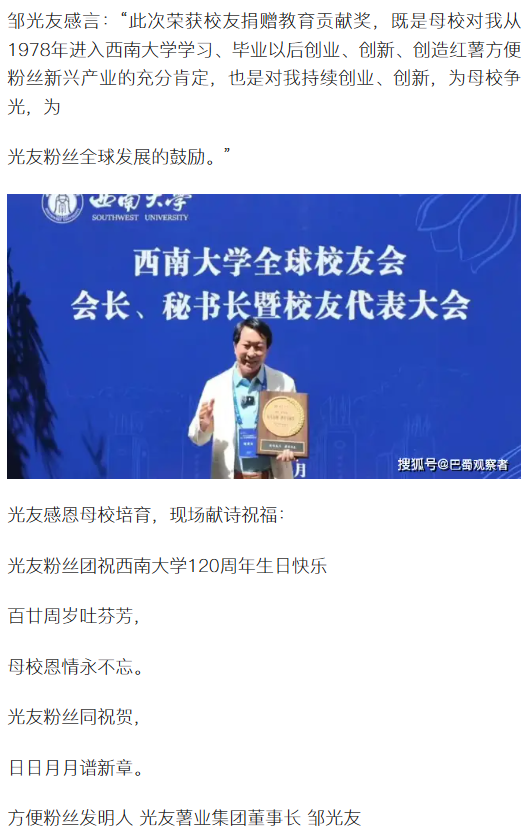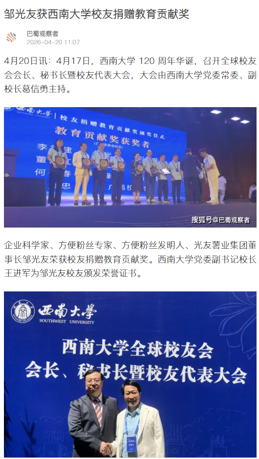 轉(zhuǎn)載搜狐網(wǎng) 鄒光友獲西南大學(xué)校友捐贈(zèng)教育貢獻(xiàn)獎(jiǎng)