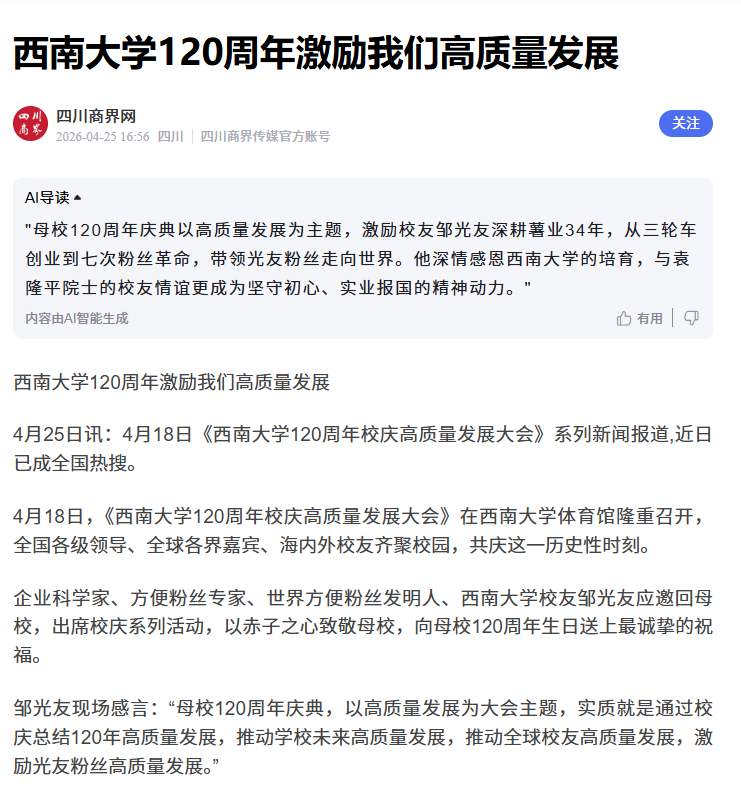 轉(zhuǎn)載四川商界網(wǎng) 西南大學(xué)120周年激勵(lì)我們高質(zhì)量發(fā)展